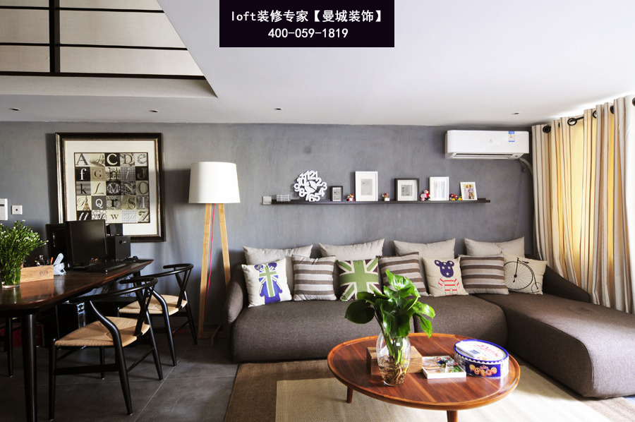 沙發背景采用是灰色的墻布,加上墻上黑色的隔板,隔板上再擺放一點生活照,感覺特別有味道,沙發是在宜家采購的布藝沙發,加上沙發上不同顏色背枕體現設計師在對軟裝上的用心.酒店式公寓裝修的房子都有一個普遍的特點就是層高不高.所以在家具 色系搭配上面要特別用心去思考.